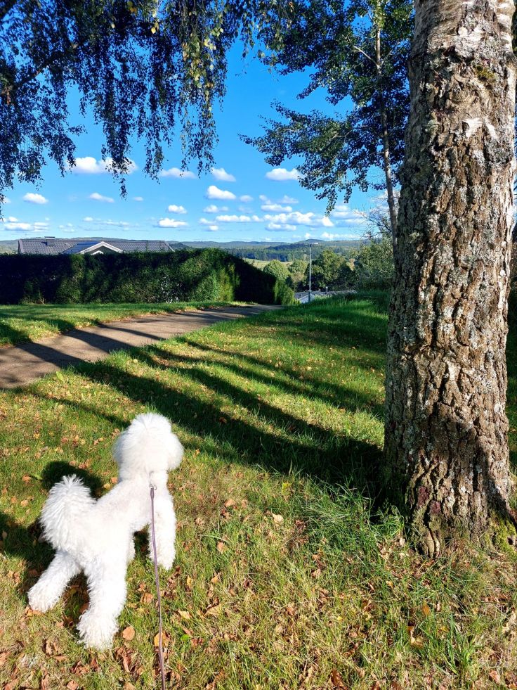 Idag har vi haft jättefint väder. Det var lite kallt i morse så jag hade faktiskt både mössa, vantar och halsduk på Fendis och min morgonpromenad, men när solen kommit upp ordentligt behövdes varken det ena eller det andra.
