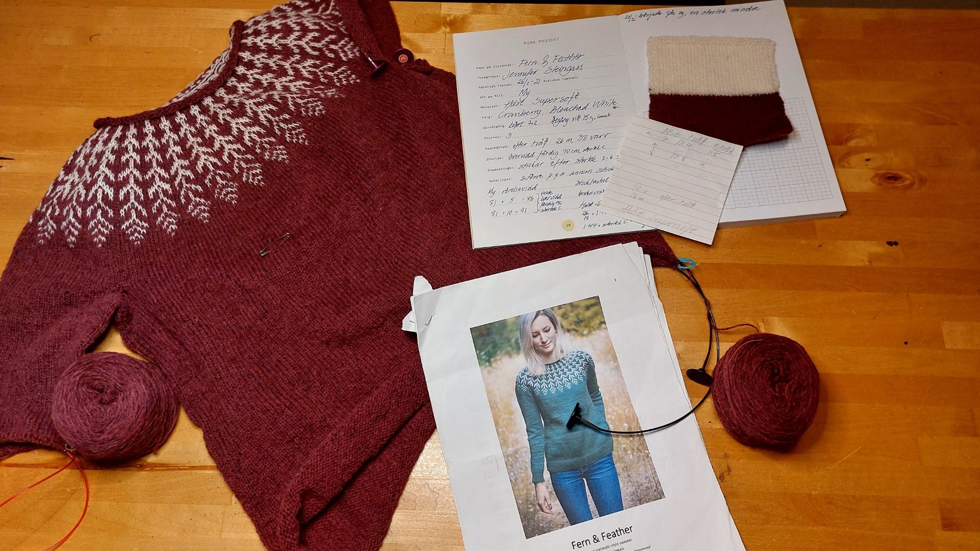 Jo, jag fick ögoneksem i början på 2021 och satte det i samband med garnet i den här tröjan. Sen har jag inte testat att sticka med det igen. Nu sätter jag mitt hopp till att det var en engångsföreteelse. Eller kanske var det inte spinnoljan i garnet jag inte tålde, utan handspriten som jag och de flesta andra använde flitigt under pandemin. Tröjan var till min äldsta dotter My. Hon fick en annan tröja i samma modell men i annat garn. Tar det 5 år till innan den här blir färdig hinner My slita ut den tröjan, annars tror jag att jag vet någon annan som kan blir glad för den här.