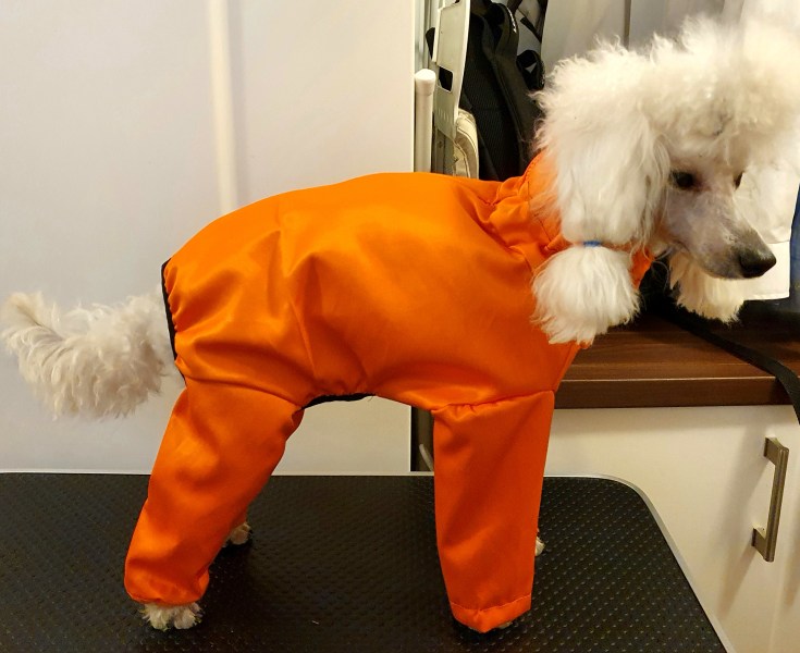 Först sydde jag en prototyp som han i princip inte kunde röra sig i, själva regnoverallen blev något bättre: