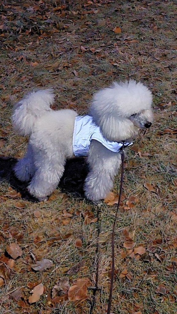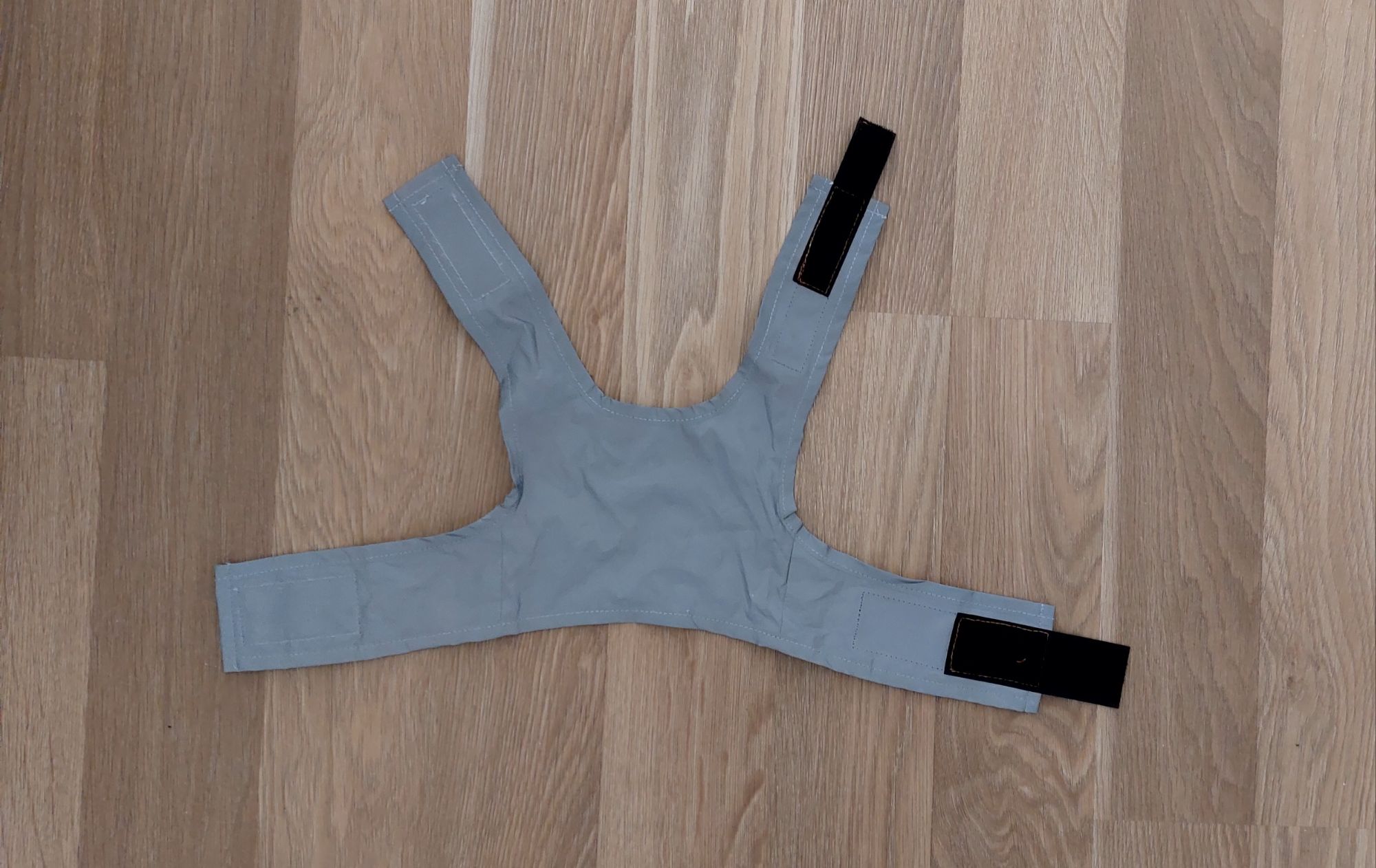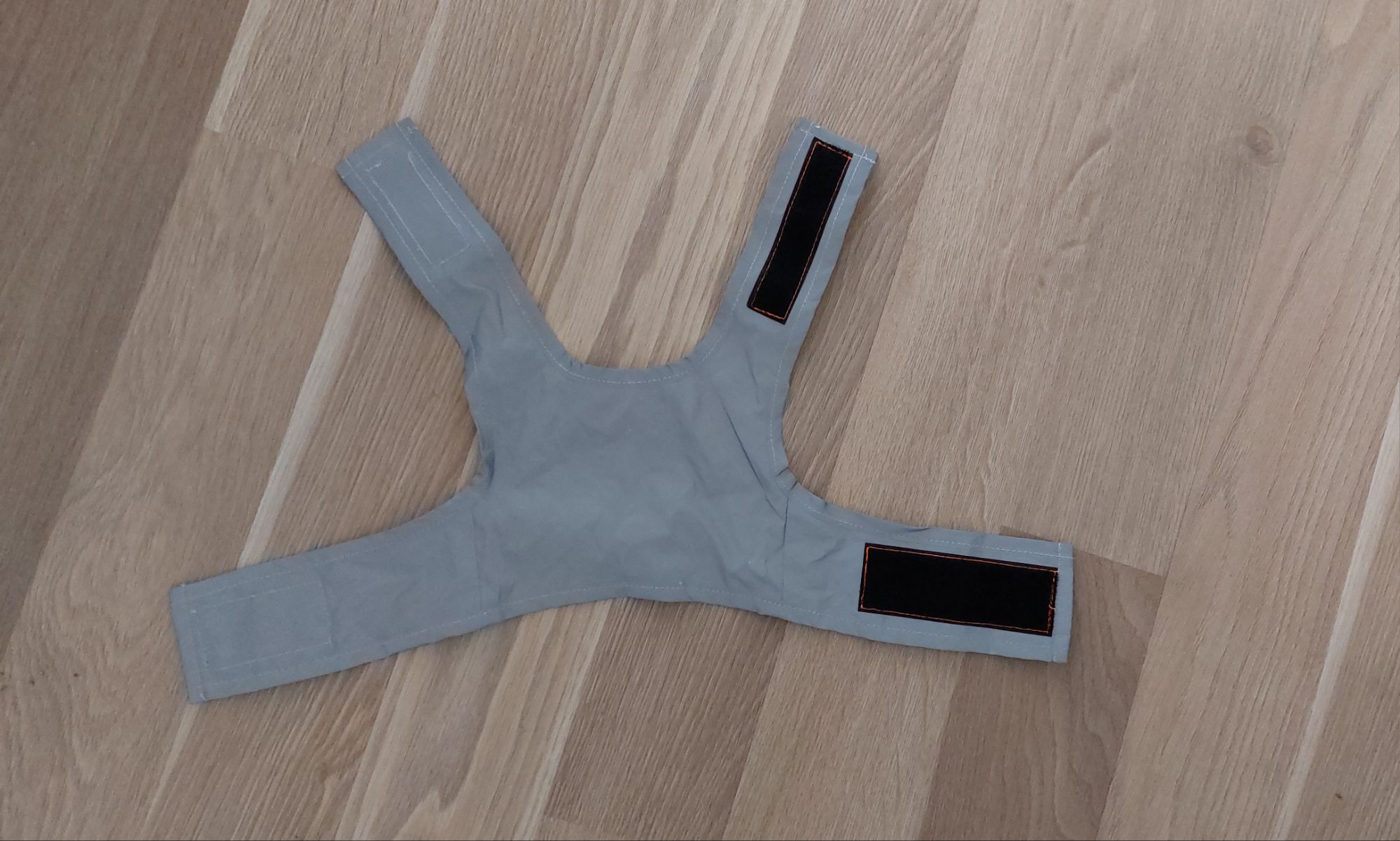 När jag rensade bland hundgrejerna häromdagen hittade jag Fendis reflexväst som han fick av svärsonen när han var valp, och det vore ju ändå bra om han skulle kunna tänka sig använda den när det är mörkt ute. Han har sluppit för att den numera är för liten. Men igår kom jag på en lika enkel som genial lösning: jag bara sprättade loss kardborrbanden och sydde fast dem längre ut. Vips – han kan reflektera igen!