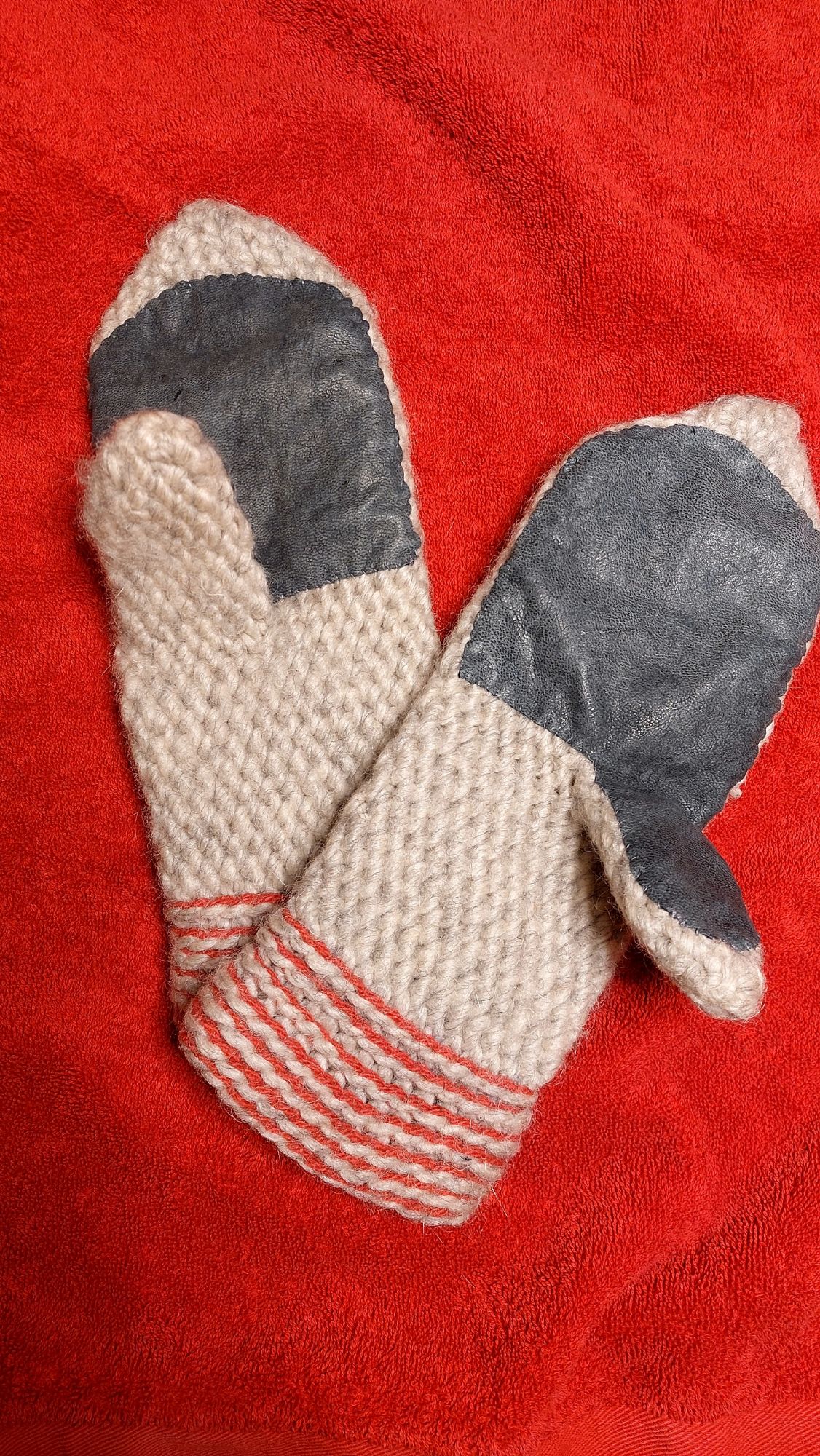 Jag tror att vantarna som jag virkade till min mormor för väldigt länge sedan är de varmaste vantar jag gjort. När hon gick bort ärvde jag tillbaka dem men sedan jag fick hund har alla mina vantar slitits väldigt mycket på insidan av handen och tummen (av kopplet), så även detta par. De legat länge och väntat på att bli åtgärdade och nu har det blivit av. Det blev kanske inte världens snyggaste förstärkning för jag har lagat dem enligt principen ”man tager vad man haver” och vad jag hade var resterna av en blågrå skinnjacka men varma är de fortfarande.