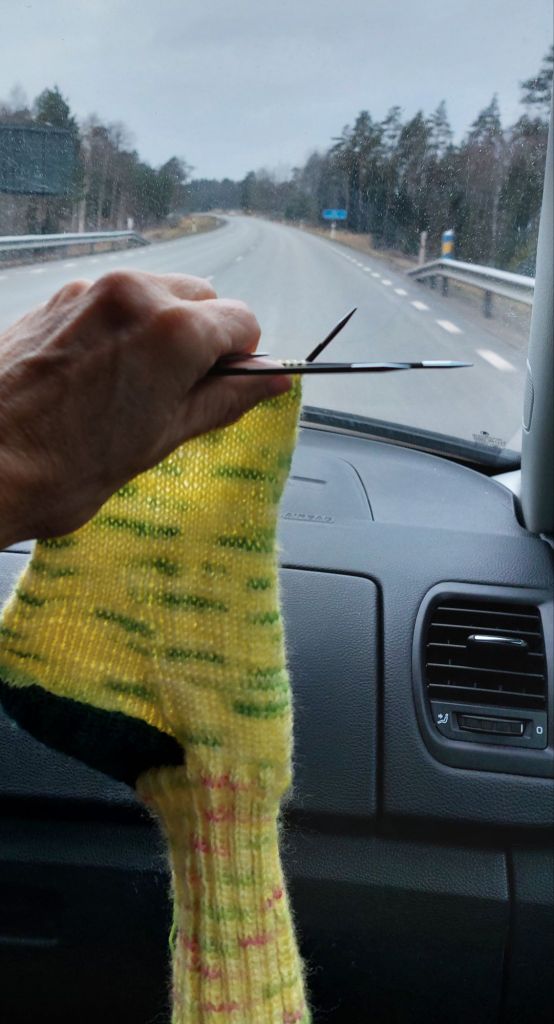 Jag beundrar alla som kan sitta och sticka under bilfärden…Det kan inte jag…eller kan å kan, jag vill helt enkelt inte…I buss har jag gjort det nån enstaka gång då vi åkt längre bort…men jag trivs med att sitta och titta på omgivningen, och kommer det skog emot tittar jag på vägen och pratar med mannen så han hålls vaken 😁