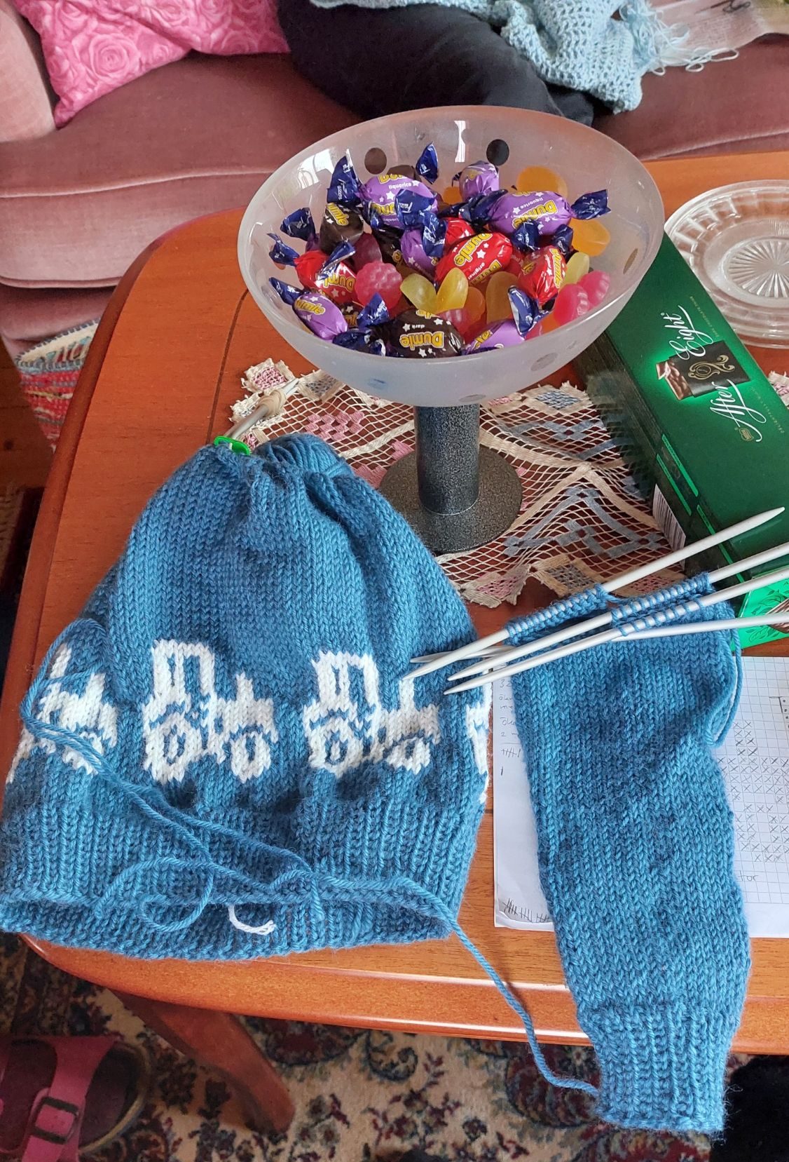 Idag stickade Teija på en traktortröja till ett barnbarn. Allt med hjul uppskattas!