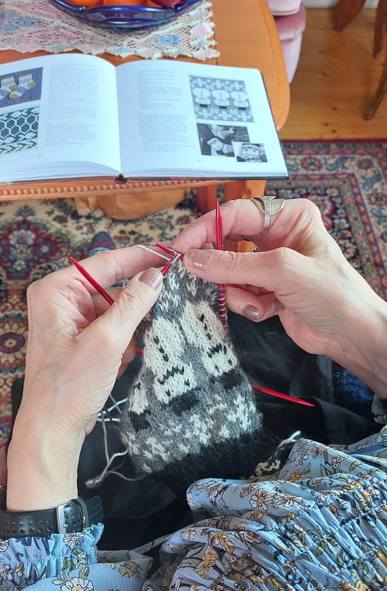 UllaCarin stickade på ett par snögubbesockor. Se hennes handarbetsväska som hon gjorde när hon gick på textillärarutbildningen: