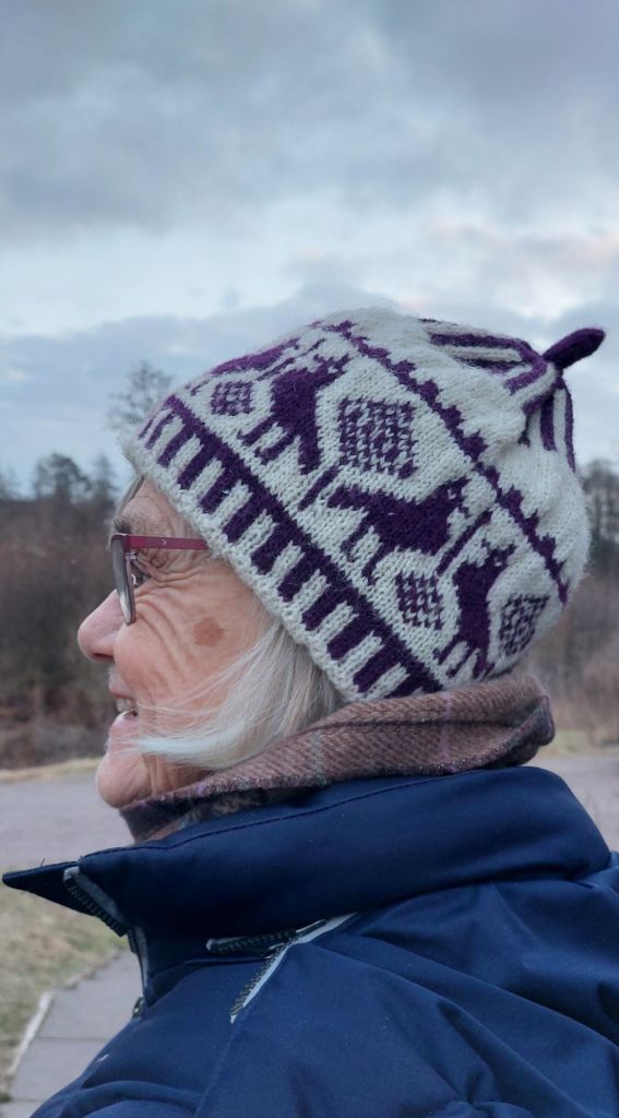 Karin virkade på en sjal. Den tog jag ingen närbild på, men när vi skulle gå hem var jag bara tvungen att fotografera hennes bingemössa med fasaner som hon stickat i lila – min favoritfärg. Binge (”hallandsstickning”) stickas annars traditionellt i blått, vitt och rött. Binge togs 2024 upp på Sveriges förteckning över immateriellt kulturarv .