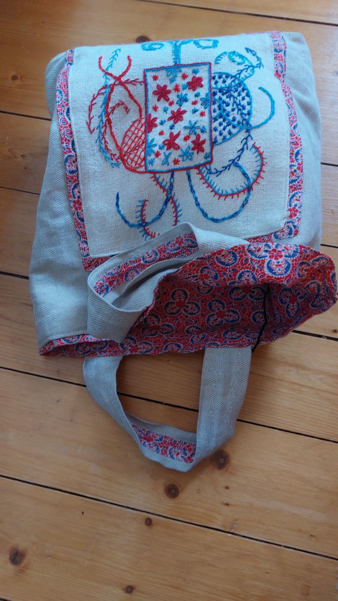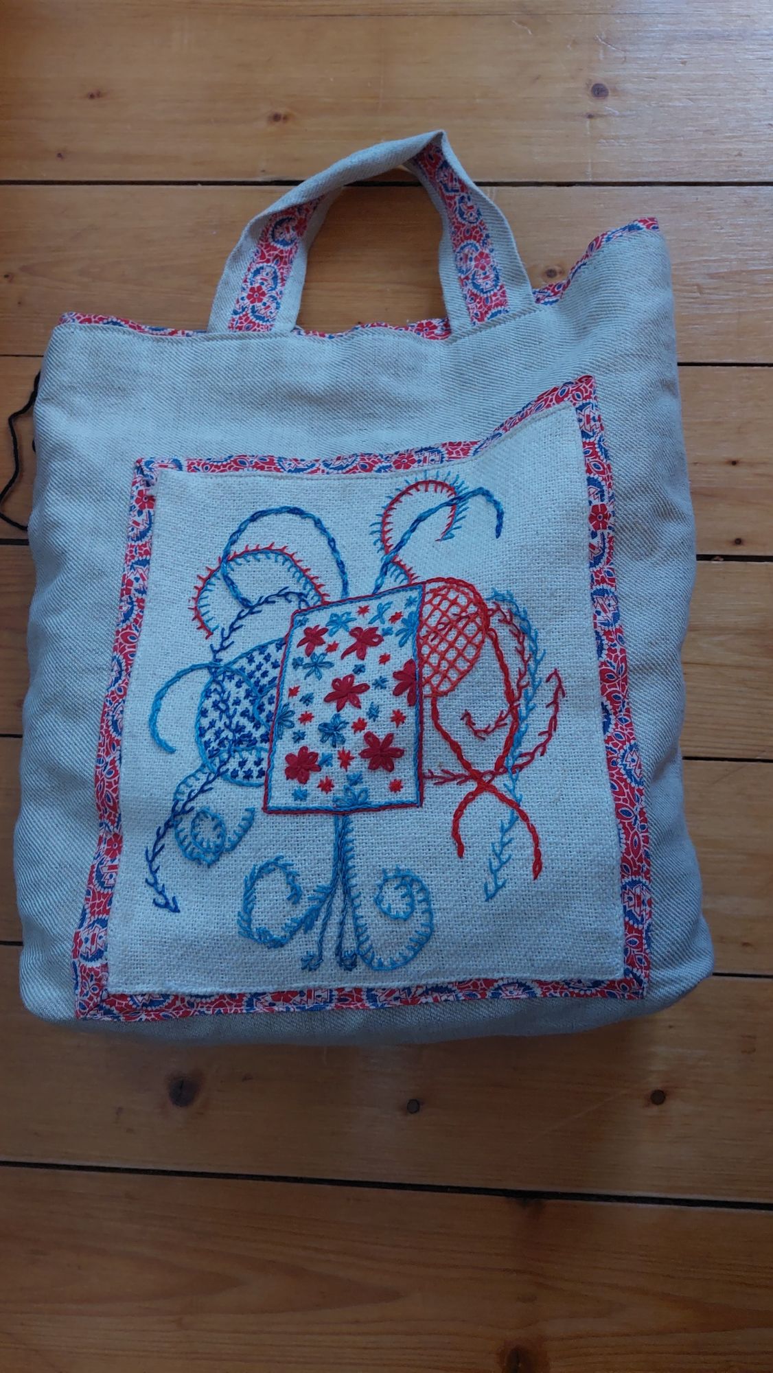 Uppgiften var att slänga två trådar på ett tyg och göra ett broderi av det mönster som bildats. Vad det sedan skulle bli av broderiet var upp till var och en. UllaCarins broderi blev till en väska, fodrad med hennes mormors klänningstyg.