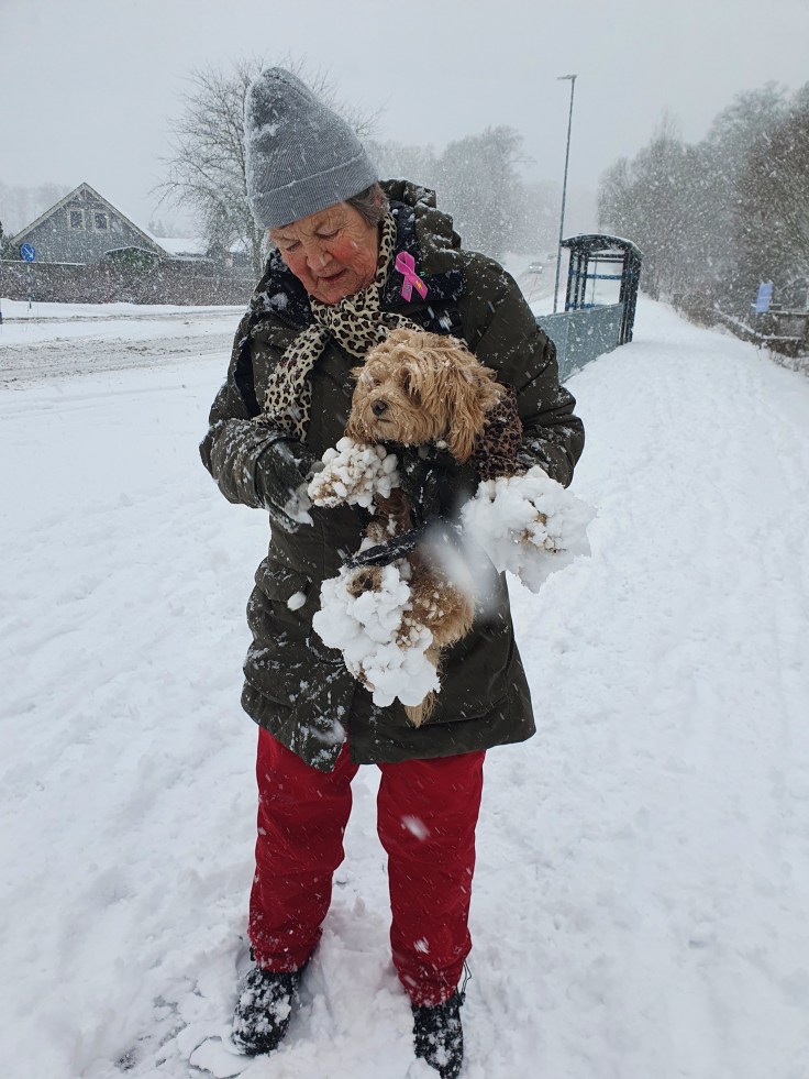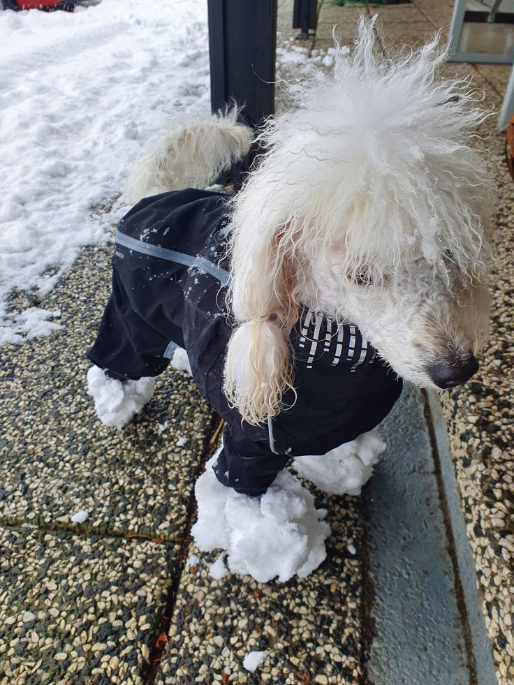 Snö kan vara ett ofog när man är en liten hund. Det här är grannen med lilla Smilla. Vi brukar gå hundpromenader tillsammans, men den här dagen fick det faktiskt bli ”walk over” för dem. De fick bli hämtade med bil. (mars 2023)