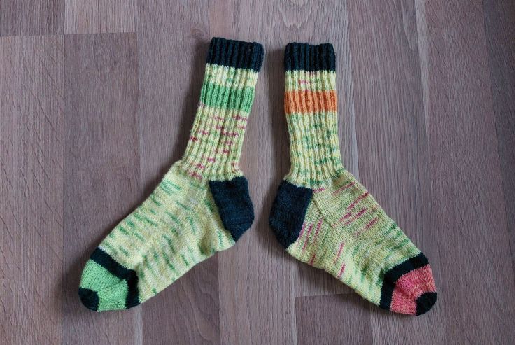 Igår kväll gjorde jag färdigt de här sockorna till Uffe. Som ni ser är det restgarnssockor men min tanke var att de ändå skulle ge intryck av någon sorts sammanhållen färg- och formgivning, och det tycker jag att jag lyckats med efter några upprepningar och omstickningar av tårna för där tog garnet slut.