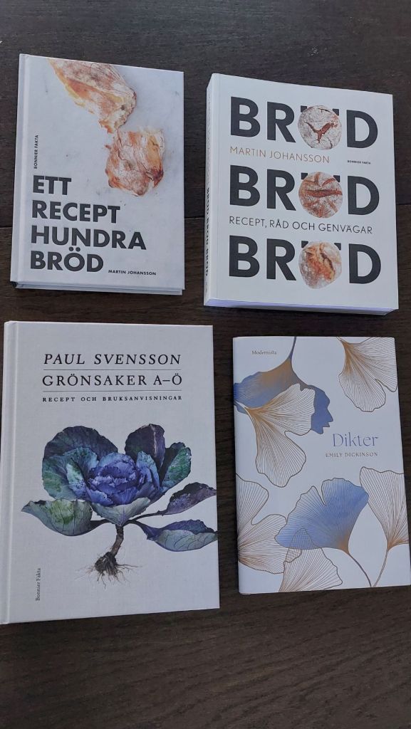 Två böcker om bröd, Paul Svenssons bok om grönsaker och en diktbok av Emily Dickinson. Den sistnämnda valde jag för att jag ibland saknat en poesibok på nattduksbordet, såna kvällar när man inte orkar läsa så mycket men ändå vill läsa några rader och fundera över innebörden en stund innan man somnar. När jag läser i förordet visar det sig att Dickinson hyllas som en av de största amerikanska poeterna, men hon blev känd först efter sin död. Den första diktsamlingen gavs ut först 1890, fyra år efter hennes död.