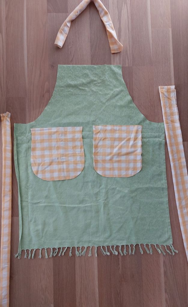Ett annat tyg (loppad duk) klipptes till till förkläde med fikor och band av mors pensionerade köksgardiner. Kanske jag beslutar mig för att go wild & crazy och behålla fransarna nertill.