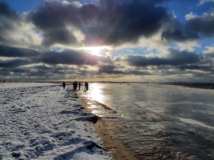 januari 2021: Corona-tider och vi träffade våra familjer utomhus. Här promenerade Uffe och jag med hans mamma och bröder med familjer på Trönningestranden strax söder om Halmstad.