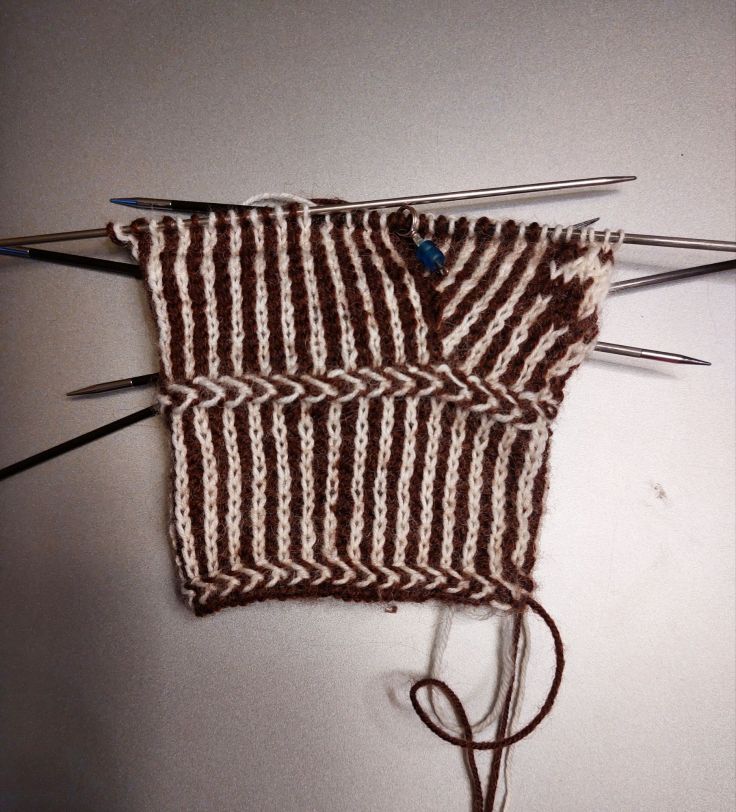 Anita använder Drops Flora till sina vantar, men jag kände att jag ville försöka använda något garn som fanns hemma och valet föll på Trekking, ett garn som Tant Kofta färgat, minns inte vad hon kallade färgen men den är mörk brun-vinröd – min favoritfärg. Garnet har legat länge och väntat på att bli sockor, men nu blir det vantar istället. Jag behöver nog gå ner i stickstorlek för att vantarna ska bli lagom stora (små) till mig. Jag har ett kvartsnummer mindre stickor hemma och har precis börjat sticka med dem för att se om vantarna blir tillräckligt små med dem. Jag sörjer inte om jag måste skaffa ännu tunnare stickor, för jag gillar egentligen inte att sticka med metallstickor, stickar hellre med kolfiberstickor.